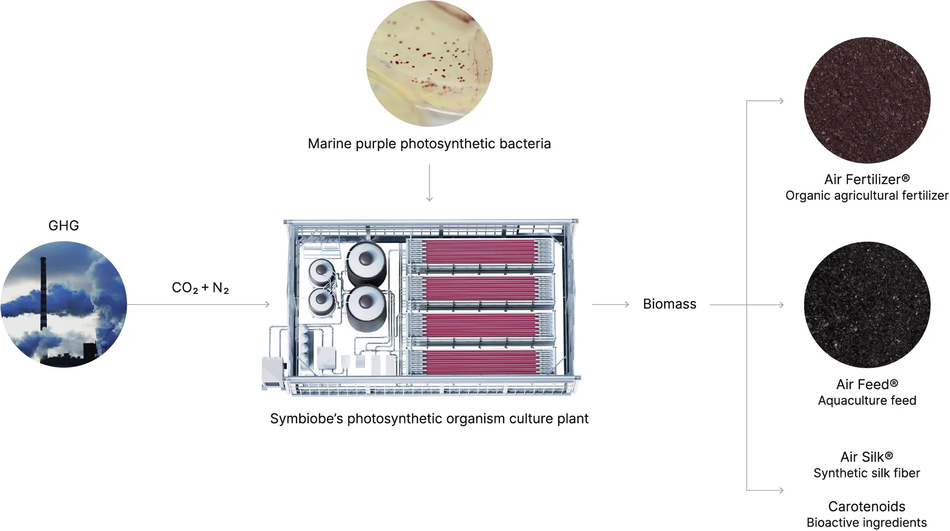 「温室効果ガス固定事業」はSymbiobeのものづくり、原料事業を支えている光合成生物、海洋性紅色光合成細菌の特性を活かし、温室効果ガスの回収、活用を図るもの。光合成生物の大量培養を可能にするプラントを利用し、温室効果ガスを高単価かつ有意義な有価物としてアップサイクルできるプラットフォーム構築に取り組んでいます。